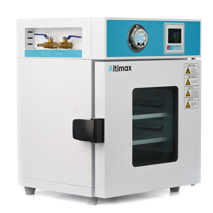 Altimax VDO-1-52 шкаф предназначен для сушки теплочувствительных, легко разлагающихся и легко окисляющихся веществ до температуры 250℃ в условиях вакуума. Уровень вакуума, который достигается в этих сушильных шкафах составляет не более 133 Па, что является достаточным для большинства процессов — нагрев фармакологических субстанций, обработка компонентов в радиоэлектронике, научные и лабораторные исследования. Нагрев производится с четырёх сторон, что вместе с принудительной вентиляцией даёт отличную точность в распределении температуры.
