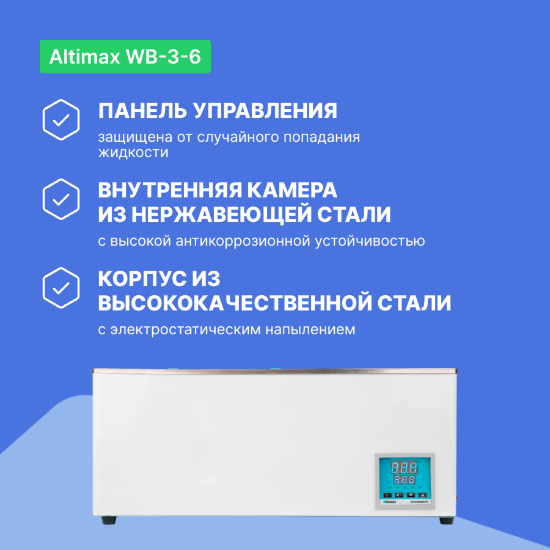 Altimax WB-3-6 — водяная баня предназначена для нагрева колб, пробирок и стаканов в диапазоне температур от комнатной до 100 °C. Она используется в медицине, биологии, биохимии, физической химии, химии, анализе качества продукции и сырья, а также в других областях, где требуется термостатирование и нагрев в узком температурном диапазоне. Баня оснащена цифровым ПИД-регулятором, защитой панели управления от случайного попадания жидкости и обеспечивает высокую точность нагрева. В ней предусмотрено 6 рабочих мест.