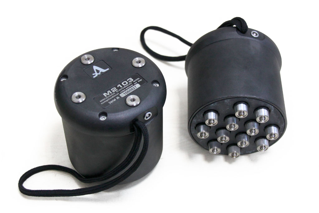 Две антенные решетки M2103 используются совместно с прибором А1220 MONOLITH и применяются для сквозного прозвучивания объектов из бетона и железобетона в диапазоне толщин от 200 до 2500 мм. Отличительной особенностью данных решеток является обследования бетонных колонн с густо расположенной арматурой, где контроль эхо-методом осложнен, а порой и невозможен из-за большого уровня структурного шума исследуемого объекта. В данном случае использование решеток М2103 повышает соотношение сигнал/шум по сравнению с эхо-методом, упрощая поиск дефектов, а также позволяет проводить измерения скорости и времени прохождения ультразвуковой волны в объектах с большой толщиной.