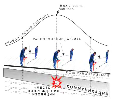 При приближении к месту повреждения сначала с датчика плавно возрастает, достигает максимального значения при положении первого оператора над местом повреждения, далее резко убывает до какого-то минимального значения при примерно симметричном расположении операторов относительно места повреждения, затем по мере удаления от места повреждения он снова резко возрастает и далее плавно убывает. Место повреждения будет находиться посередине между операторами, в тот момент, когда сигнал достиг минимального значения.