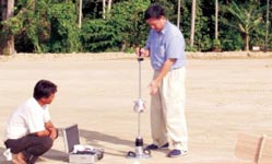 Груз известного веса падает с фиксированной высоты, воздействуя при этом с определенной силой удара на нагрузочную плиту. Нагрузочная плита под действием силы удара вызывает осадку грунтового основания. Ускорение, скорость и величина осадки подвергаются электронной обработке и рассчитывается динамический модуль упругости (Evd).