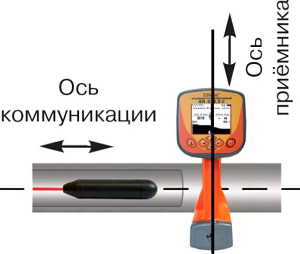 Местоположение зонда определяют по месту с максимальным уровнем сигнала. Глубину залегания зонда приемник измеряет корректно только при его положении в точке над зондом и горизонтальном положении зонда.