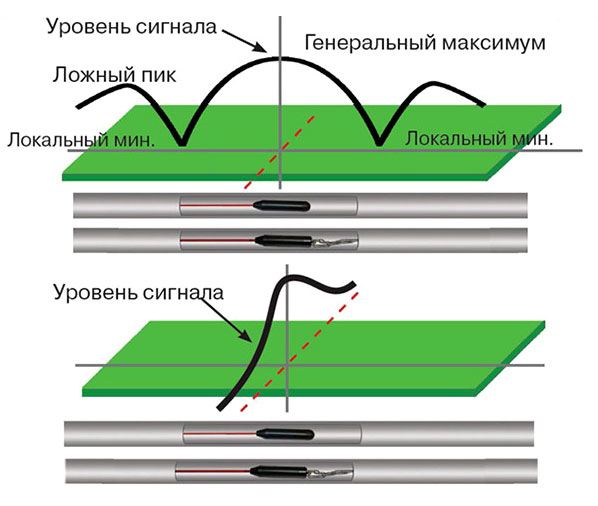 Для точного определения местонахождения зонда используют положение локальных минимумов и максимума сигнала.