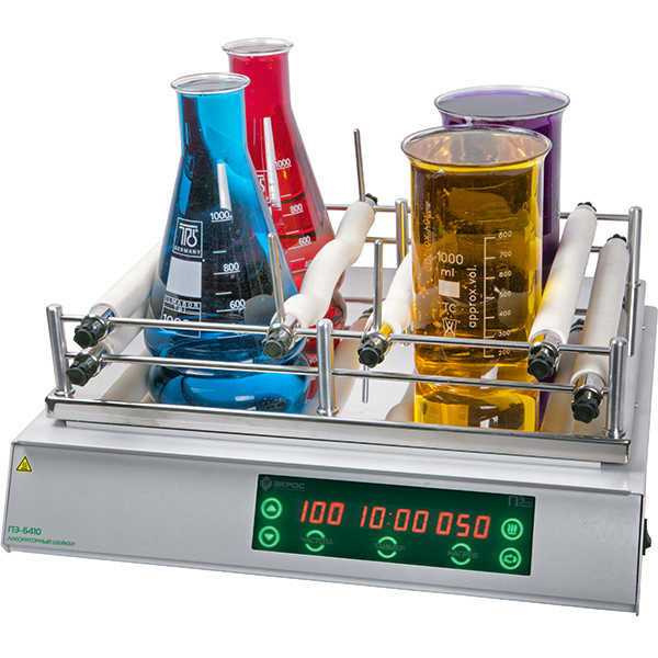 Устройство предназначено для одновременного перемешивания в горизонтальной плоскости жидкостей в нескольких сосудах объемом от 100 до 1000 мл с возможностью подогрева.