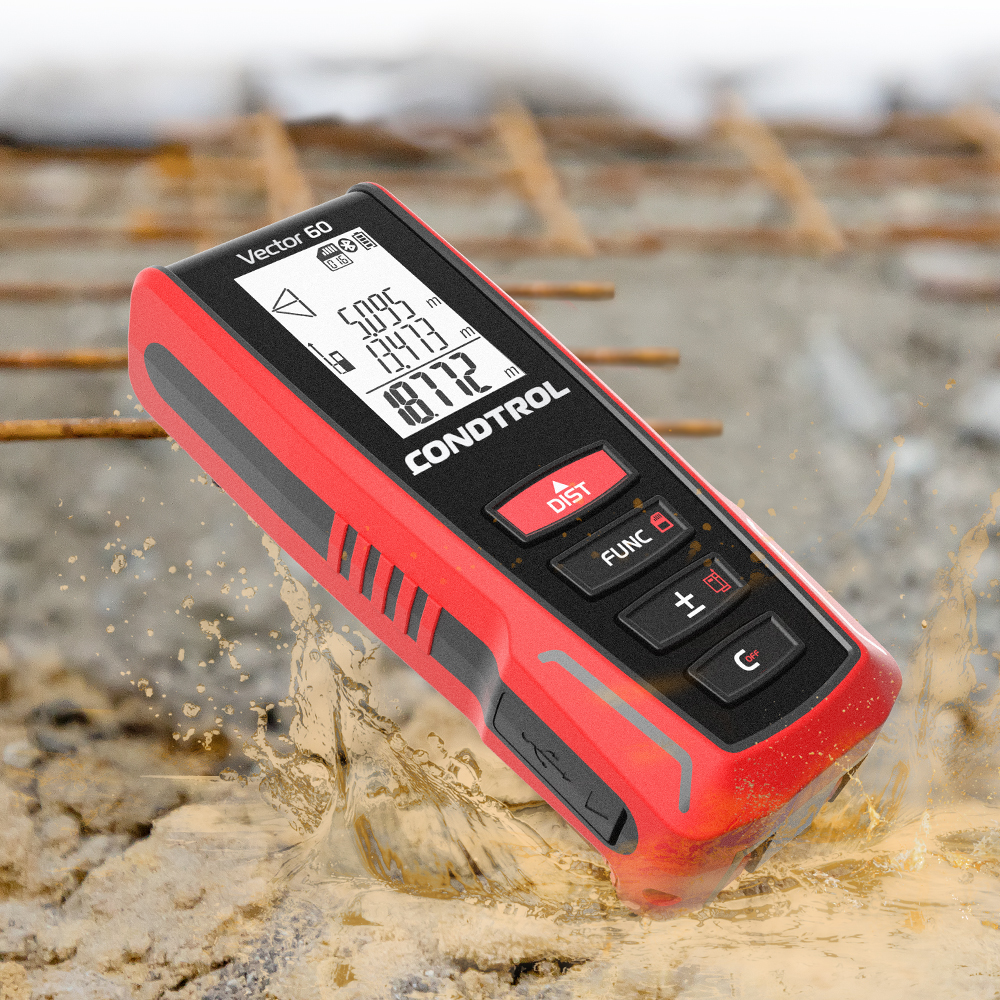 Защищённый корпус — Эргономичная форма лазерной рулетки CONDTROL Vector 60 и рельефная поверхность обеспечивают надёжный обхват прибора. Герметичность корпуса по стандарту IP54 позволяет использовать CONDTROL Vector 60 в условиях стройплощадки. Дальномер имеет четыре кнопки управления, которые удобно нажимать даже в перчатках