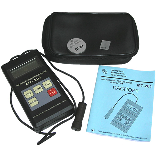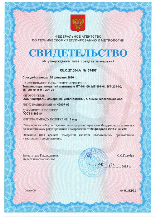 Магнитный толщиномер покрытий МТ-201 внесен в государственный реестр средств измерения под номером №42007-09, сертификат RU.C.27.004.A №37497.