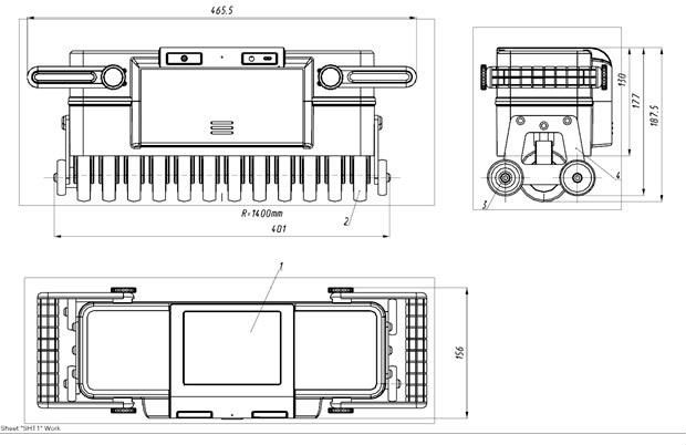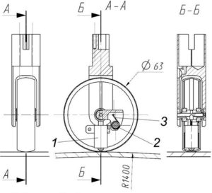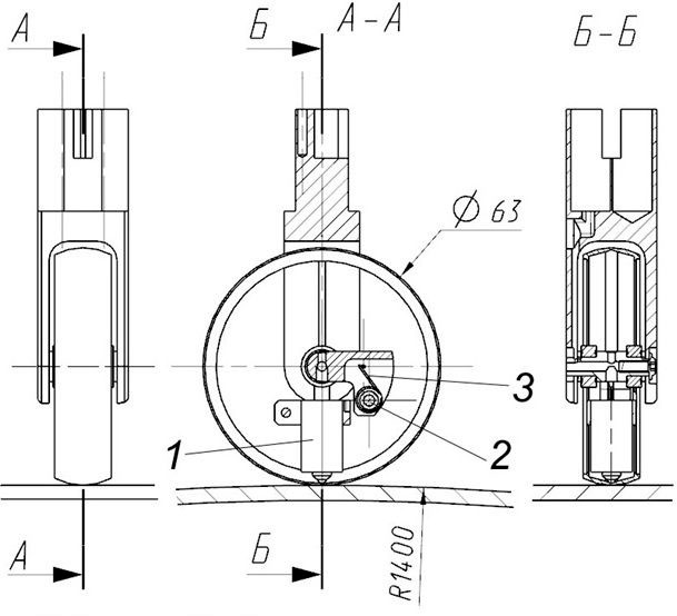 • Одна из пар опорных колёс закреплена на корпусе моноблока неподвижно. Другая пара установлена на оси, и может, как маятник поворачиваться вокруг неё в небольших пределах, заданных ограничителями. Такое решение обеспечивает устойчивую установку моноблока всеми четырьмя колёсами на поверхность ОК не только цилиндрической формы вдоль образующей, но и под острым углом к ней, а также на поверхности конической, сферической и более сложной формы, но с локальным радиусом кривизны не менее 1400 мм.