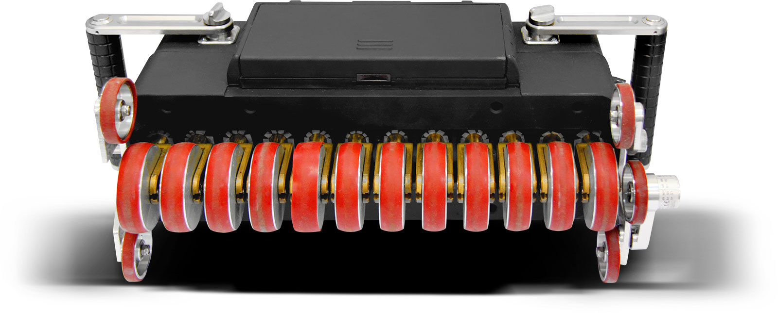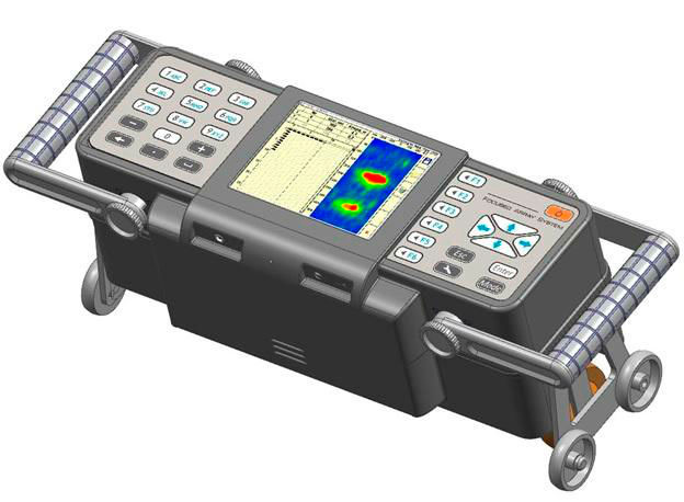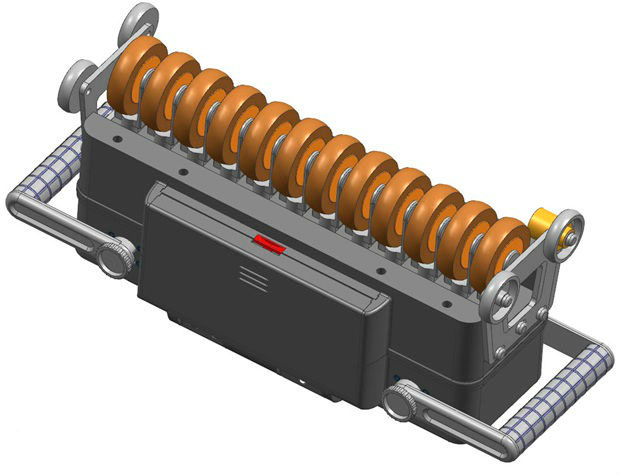 • АР моноблока смонтирована в нижней части прямоугольного корпуса, который снабжён ручками для его удержания. Ручки имеют несколько фиксированных положений, поэтому их можно установить под разными углами к лицевой панели. Все элементы АР имеют независимый подпружиненный подвес и могут перемещаться вдоль своих продольных осей. Это позволит вести контроль не только плоских участков ОК, но и выпуклых с радиусом кривизны от 1400 мм и более, а также и вогнутых с таким же минимальным радиусом. (Рис.3)