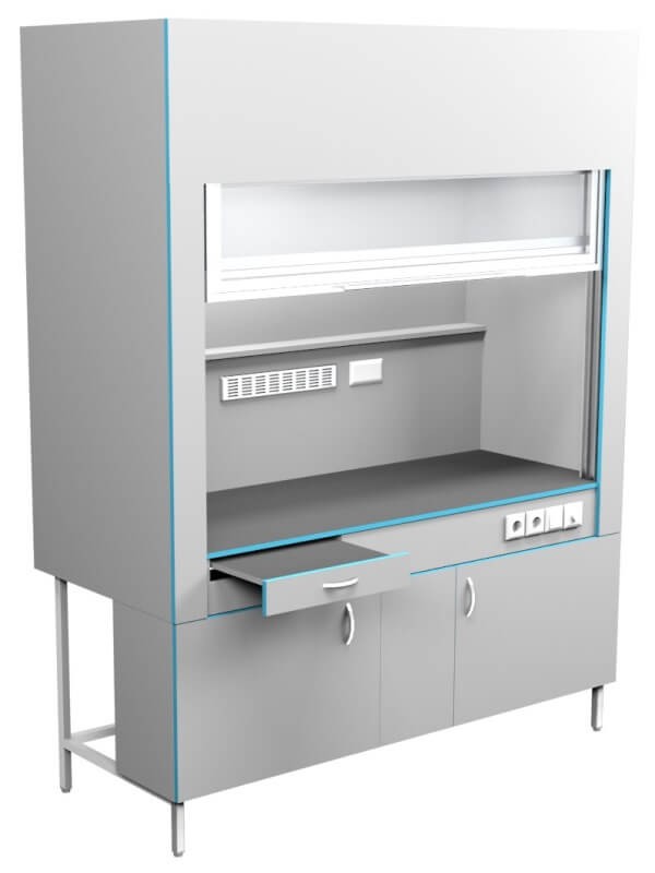 Шкаф вытяжной без сантехники ШВ НВК 1800 МОН (1800×716×2200). Описание: Вытяжные лабораторные шкафы применяются при работе с токсичными и вредными летучими материалами, с чистыми материалами, с растворением или разложением под температурной обработкой, при проведении анализа проб и многих других. Особенности: Дополнительная подсветка сбоку с плавной регулировкой Выдвижной столик Вытяжка из нижней тумбы позволяет хранить в ней реактивы Ударопрочный подъемный экран легко поднимается одной рукой Экран в поднятом состоянии не увеличивает высоту шкафа Внутри рабочей камеры полочка для хранения реактивов Две влагозащищенных розетки с крышкой внутри рабочей камеры Специальные доводчики в тумбе позволяют закрывать тумбу бесшумно По заказу столешницы могут быть выполнены из: химстойкого пластика керамогранита (плитка) полипропилена нержавеющей стали монолитной керамики эпоксидного керамзита