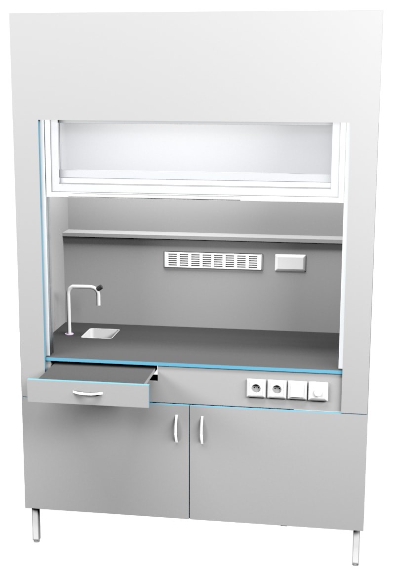 Шкаф вытяжной с сантехникой ШВ НВК 1500 ПП+ (1500×716×2200). Описание: Вытяжные лабораторные шкафы применяются при работе с токсичными и вредными летучими материалами, с чистыми материалами, с растворением или разложением под температурной обработкой, при проведении анализа проб и многих других. Особенности: Полипропиленовая раковина, обладающая высокой химической стойкостью Химически стойкий кран из латуни с полипропиленовым напылением для подключения холодной воды Дополнительная подсветка сбоку с плавной регулировкой Выдвижной столик Вытяжка из нижней тумбы позволяет хранить в ней реактивы Ударопрочный подъемный экран легко поднимается одной рукой Экран в поднятом состоянии не увеличивает высоту шкафа Внутри рабочей камеры полочка для хранения реактивов Две влагозащищенных розетки с крышкой внутри рабочей камеры Специальные доводчики в тумбе позволяют закрывать тумбу бесшумно По заказу столешницы могут быть выполнены из: химстойкого пластика керамогранита (плитка) полипропилена нержавеющей стали монолитной керамики эпоксидного керамзита