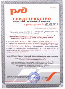 Приборы для измерения твёрдости материалов по Шору А и D (дюрометры) модификаций ТВР-А, ТВР-АМ, ТВР-D, ТВР-DМ являются средствами измерений, зарегистрированными в Государственных реестрах СИ России под № 59928-15 и Республики Казахстан под № KZ.02.03.07058-2016/59928-15, межповерочный интервал 1 (один) год.