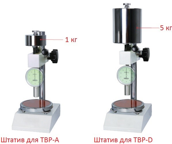 Штатив может быть приобретён совместно с дюрометром ТВР-А, либо приобретён позднее при необходимости его использования, например для массовых испытаний. Ввиду необходимости приложения нагрузки в 1 кг при каждом замере (а таких замеров на КАЖДОМ изделии по ГОСТ должно быть не менее 5-ти для вычисления среднего значения твёрдости этого изделия) использование штатива является настоятельной рекомендацией – даже тренированному мужчине крайне тяжело произвести подряд 20…40 замеров с плавным нагружением и дальнейшим удержанием нагрузки в 1 кг без колебаний руки с прибором на контролируемом изделии в течение 2…15 секунд согласно требованиям ГОСТ.
