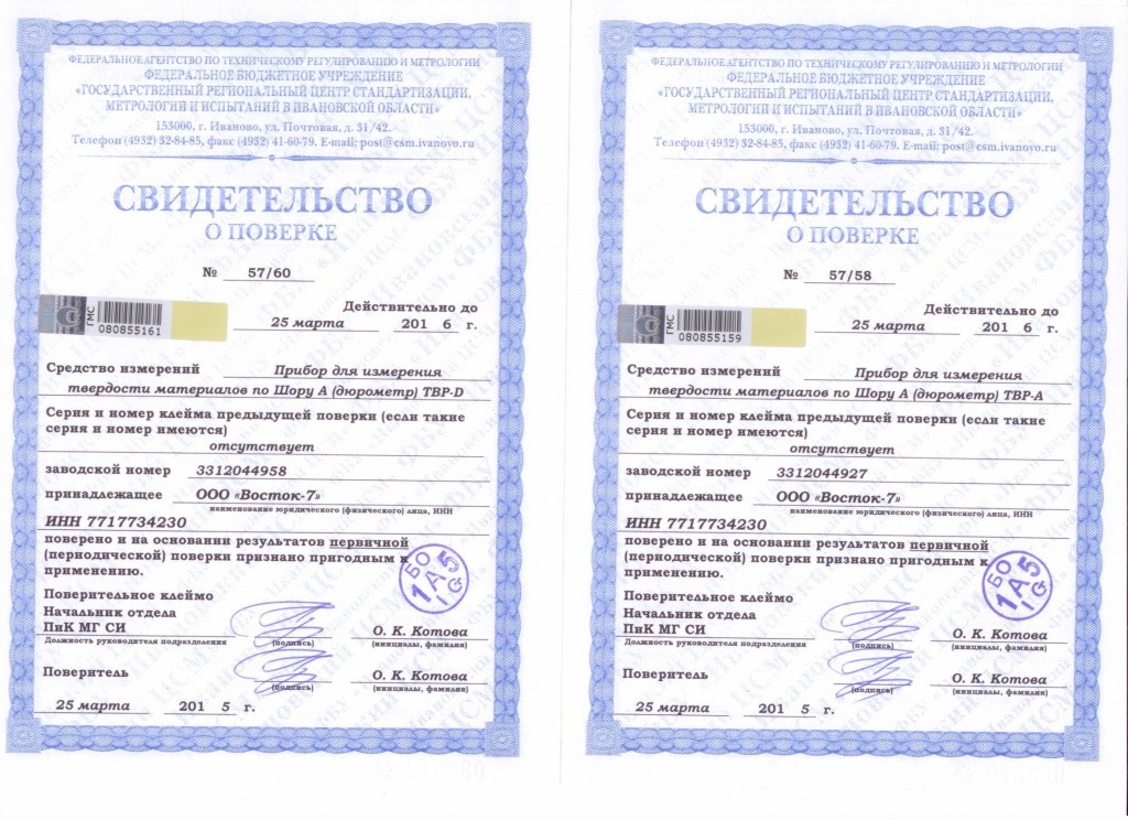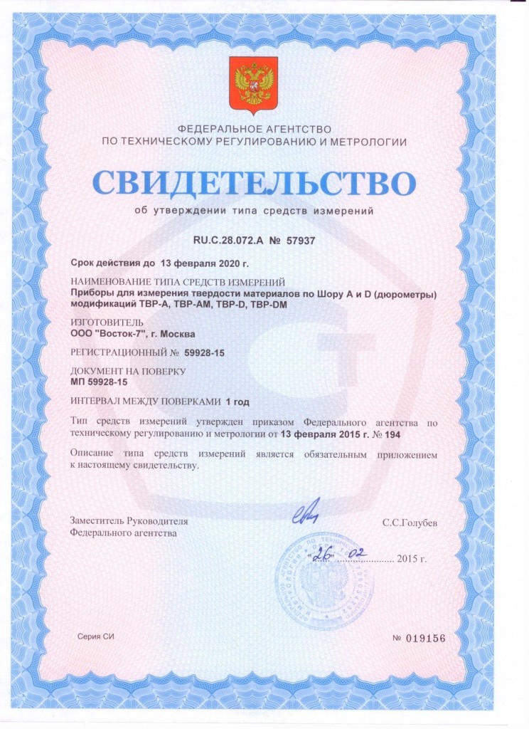 Приборы для измерения твёрдости материалов по Шору А и D (дюрометры) модификаций ТВР-А, ТВР-АМ, ТВР-D, ТВР-DМ являются средствами измерений, зарегистрированными в Государственных реестрах СИ России под № 59928-15 и Республики Казахстан под № KZ.02.03.07058-2016/59928-15, межповерочный интервал 1 (один) год.
