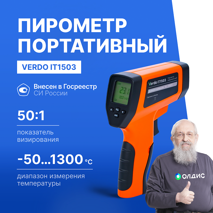 Пирометры инфракрасные Verdo IT1503 предназначен для бесконтактного измерения температуры поверхностей твёрдых тел, газовых струй и расплавов различных материалов. Работает на основе преобразования потока инфракрасного излучения исследуемого объекта через оптическую систему и инфракрасный фильтр на фотоэлектрический приёмник. Затем сигнал преобразуется внутренней микропроцессорной системой в цифровой сигнал. Пирометр изготовлен в пластиковом корпусе с инфракрасным датчиком, лазерным целеуказателем и кнопкой для измерения температуры и включения пирометра. На лицевой стороне расположены жидкокристаллический дисплей и кнопки управления. Микропроцессорная система пирометров обеспечивает обработку результатов измерений и индикацию текущего значения температуры объекта на дисплее.